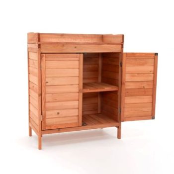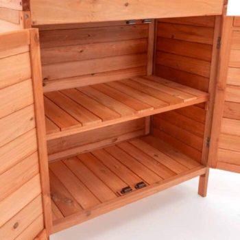 Este armario está diseñado teniendo en cuenta su uso tanto en interiores como en exteriores. Además, sus patas elevadas proporcionan protección contra la humedad del suelo y previenen la aparición de moho. Aún así se recomienda aplicar un barniz o capa protectora para garantizar su resistencia a la humedad y prolongar su vida útil.