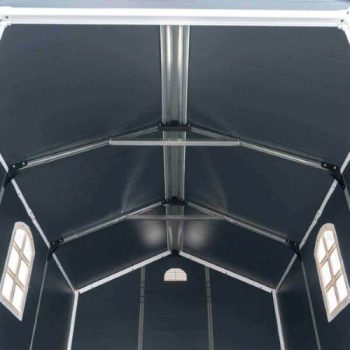 Caseta de resina tipo polipropileno tubular (grosor de pared: 12 mm). Su diseño cuenta con un tejado a dos aguas para evitar su acumulación. Tiene respiraderos en la parte frontal para que la condensación de humedad sea mínima mientras que su ventana lateral hecha en polipolipropileno proporciona luminosidad al interior. Las dos puertas abatibles facilitan el acceso y la salida de objetos grandes. Cuenta con un cerrojo de pasador para mayor seguridad de tus pertenencias. Puedes añadirle un candado (no incluido). No viene con suelo.