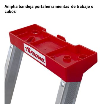La escalera de tijera con peldaños cómodos Elegance esta fijada con remaches de acero de gran resistencia, posee un sistema de refuerzos en zonas vulnerables que dotan al modelo de una gran estabilidad, tarima de acero antideslizante de 27×27 cm. y una amplia bandeja portaobjetos.