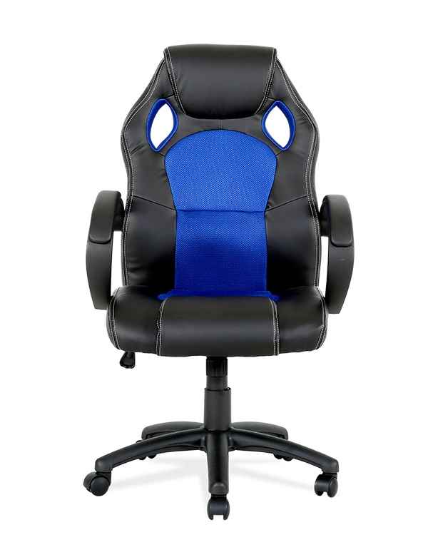 Materiales: -Asiento y respaldo acabado mixto – PU (piel sintética) y tela. Base, estructura y apoyabrazos en ny