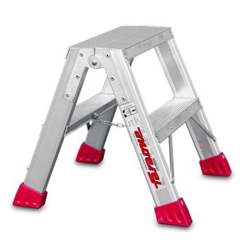 El Taburete de doble subida TPAS está fabricado en aluminio, posee un sistema de bisagras rígido y resistente entre los dos tramos de subida, un sistema anti cierre seguro, peldaños de 8 cm y amplios tacos de goma con un muy buen agarre a la superficie.